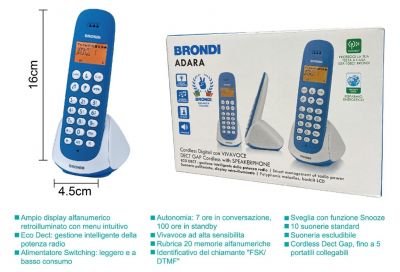 BRONDI TELEF. CORDLESS ADARA AZZURRO/BIA DECT GAP FINO A 4 PORTATIL VIVAVOCE DISPLAY ILLUMI
