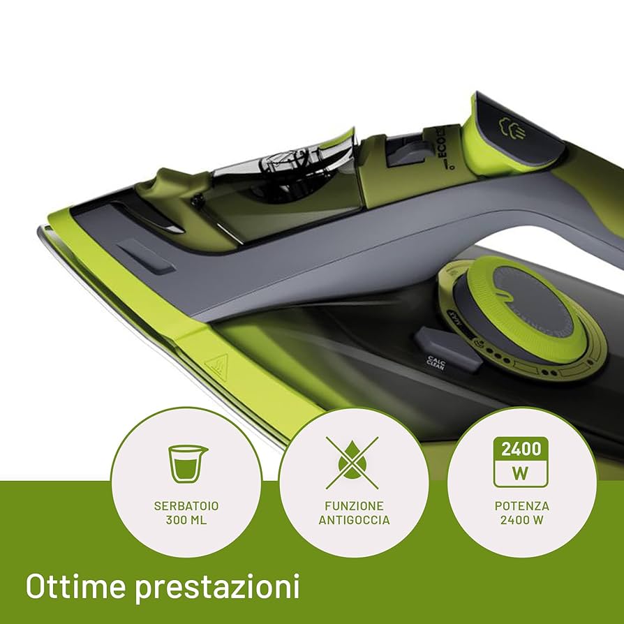 Il sistema anticalcare Zerocalc 3X, con doppio filtro e funzione Calc Clean, protegge il ferro dalla formazione di calcare, prolungandone la durata. Il serbatoio da 300 ml offre una buona autonomia, mentre l’impugnatura ergonomica e il design compatto rendono l’utilizzo comodo e pratico.